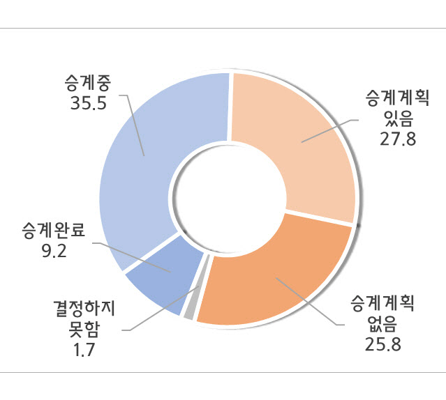 특히 자녀에게 승계하지 않을 시 중소기업의 30.2%는 ‘향후 매각 또는 폐업을 고려 중’이라고 응답해 승계 공백을 메우기 위한 제3자 승계 등 대안 마련이 필요하다는 점이 나타났다.
