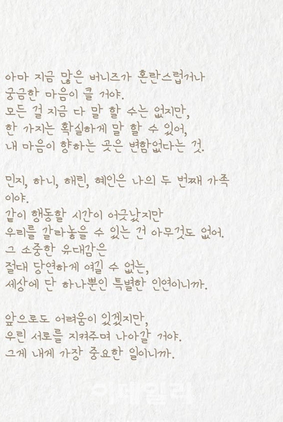 해당 편지에 다니엘은 “지나온 시간을 놓아주는 게 쉽지 않겠지만 이제는 과거를 잠시 내려놓고 정말로 소중한 것들, 우리의 마음, 꿈, 그리고 앞으로 마주할 따뜻한 날들에 집중하고 싶다”고 썼다.