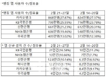 그 사이 신한은행과 농협은행 등의 약진이 두드러졌다. 신한은행은 전 주 6만3000건 신규 설치에 불과했으나 지난주 12만8000건 증가하며 2배 이상의 상승세를 보였다. 농협은행 또한 같은 기간 7만 건에서 13만 건으로 약 5만 건 증가하며 카뱅 앱을 넘어서는 모습을 보였다. 이 외에 하나은행은 8만2000건에서 9만건으로, 우리은행은 4만2000건에서 6만건으로 상승했다.