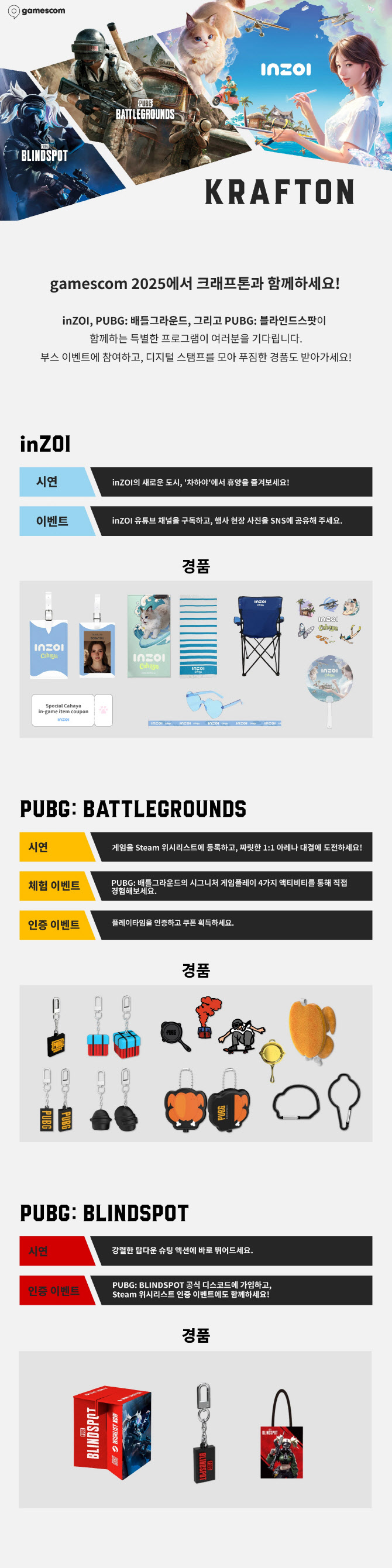 크래프톤은 이번 행사에서 ‘inZOI(인조이)’, ‘PUBG: 블라인드스팟’, ‘PUBG: 배틀그라운드’ 등 3종 게임을 중심으로 시연 기회를 제공하며, 이용자 참여 중심의 다양한 프로그램을 통해 브랜드 체험을 강화한다.