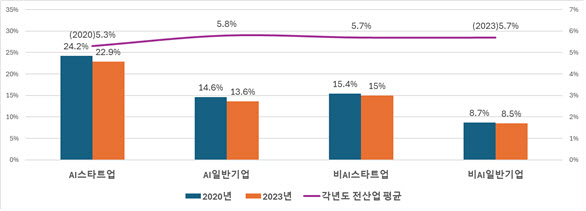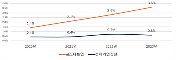연구개발비 구조에서도 취약성이 드러났다. AI스타트업의 연구개발비 중 정부재원 비중은 22.9%로 전산업 평균 5.7%의 네 배에 달한다.