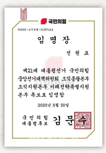 지난달 30일 자의 임명장에는 ‘제21대 대통령선거 국민의힘 중앙선거대책위원회 조직총괄본부, 조직지원본부, 미래전략특별지원본부 특보로 임명한다’는 내용이 담겼다.
