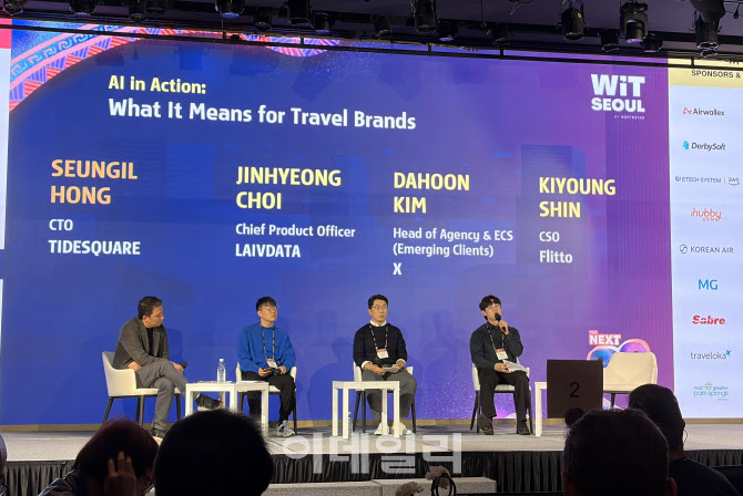 | | 27일 서울 여의도 페어몬트 앰배서더에서 타이드스퀘어가 주최한 여행 기술 콘퍼런스 ‘WiT 서울 2025’에서 발표를 하고 있는 최진형 라이브데이터 CPO, 김다훈 엑스 코리아 총괄, 신기영 플리토 CSO (사진=이민하 기자) |