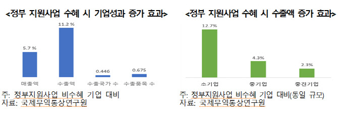 한국무역협회 국제무역통상연구원이 8일 발표한 ‘정부지원사업의 수출기업 성과 영향 분석’ 보고서에 따르면 정부의 지원사업(금융, 기술, 인력, 판로 등)에 참여한 수출기업은 비참여기업보다 매출액 5.7%, 수출액 11.2%가 더 증가한 것으로 나타났다.