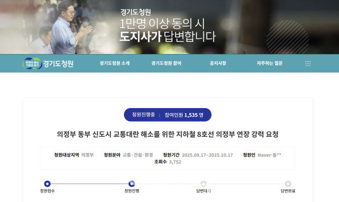 24일 경기도에 따르면 1만명 이상 동의 시 도지사가 답변하는 경기도청원에 지난 17일 ‘의정부 동부 신도시 교통대란 해소를 위한 지하철 8호선 의정부 연장 강력 요청’이라는 제목의 청원글이 올라왔다.