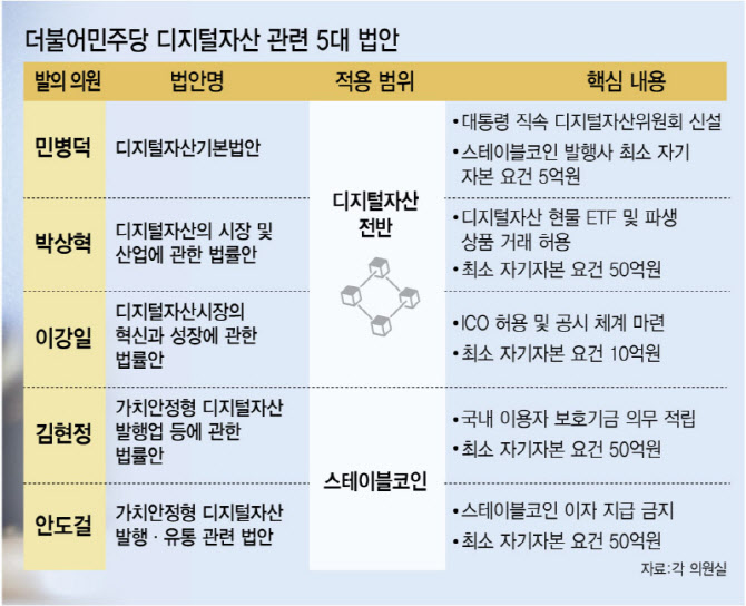 관련해 민주당은 디지털자산을 제대로 평가·보호·순환시키기 위한 ICO 제도화, 원화 스테이블코인 도입 등을 담은 디지털자산기본법을 추진 중이다. 이 기본법 처리에 속도를 내 디지털자산 관련 기업의 투자를 활성화하고 코스닥 3000을 달성하자는 게 민 의원이 제안한 복안이다.