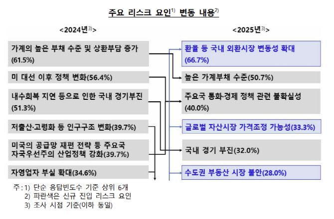 환율 외에도 글로벌 자산시장 가격 조정 가능성이 33.3%, 수도권 부동산 시장 불안이 28% 등으로 집계되는 등 신규 리스크 요인들도 눈에 띄었다. 반면 지난해 리스크로 꼽힌 △저출산·고령화 등 인구구조변화 △자영업자 부실 확대 등은 후순위로 조정됐다.