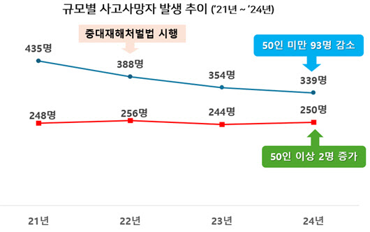 한국경영자총협회(경총)가 22일 발표한 ‘도급 시 안전관리 정책의 문제점 및 개선방안’ 보고서에 따르면 고용부가 발표하는 ‘재해조사 대상 사망사고 발생 통계’ 현황에 따르면 중처법이 우선 적용된 사업장(50인·억원 이상)의 사망재해 감소효과는 ‘없음’으로 나타났다.