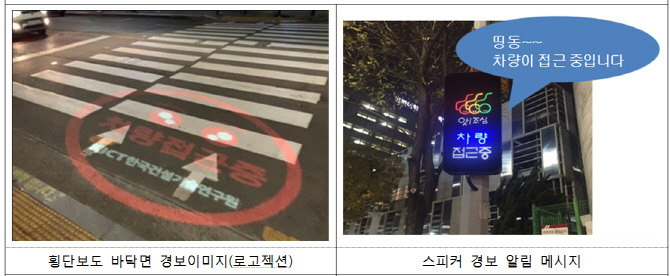 아울러 보행자에게는 시각, 청각, 촉각을 이용한 3중 경보시스템이 작동된다. 시속 10km/h 이상의 차량이 접근 시 횡단보도 바닥면에는 프로젝터를 이용한 경보 이미지(로고젝터)를 표시하고 스피커에서는 위험 알림 경보가 울리며, 스마트폰 앱에서는 진동과 경보 메시지를 통해 위험을 알린다.