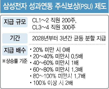 삼성전자는 이에 따라 CL 1~2 직원에게는 200주, CL 3~4 직원에게는 300주씩을 지급하기로 이달 중 약정하고, 3년 뒤 주가 상승 폭에 따라 지급주식 수량을 확정해 2028년부터 3년간 균등 분할 지급하겠다고 밝혔다. 주가 상승폭에 따른 지급은 기준주가와 2028년 10월 13일 기준주가를 비교해 상승률이 △20% 미만 시 0배 △20~40% 미만 시 0.5배 △40~60% 미만 시 1배 △60~80% 미만 시 1.3배 △80~100% 미만 시 1.7배 △100% 이상 시 2배다.