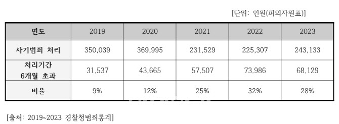 그에 따르면 사기범죄 발생은 꾸준히 증가했지만 사기 범죄자 검거 건수나 사건 처리 건수는 줄어들고 사건처리 기간은 6개월을 초과하는 비율이 2배 이상 급증했다. 구체적으로 2019년 9%였던 ‘6개월 초과 처리 비율’이 2021년 25%, 2022년 32%까지 치솟았다.