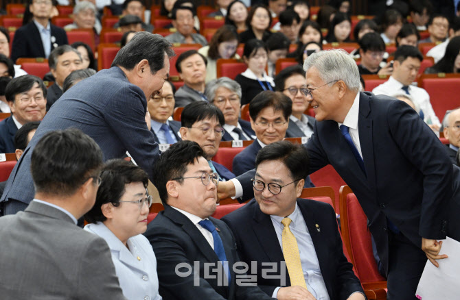 [이데일리 김태형 기자] 문재인 전 대통령과 정세균 전 국무총리가 25일 서울 여의도 국회도서관에서 열린 4.27 판문점선언 7주년 기념식에서 인사하고 있다.
