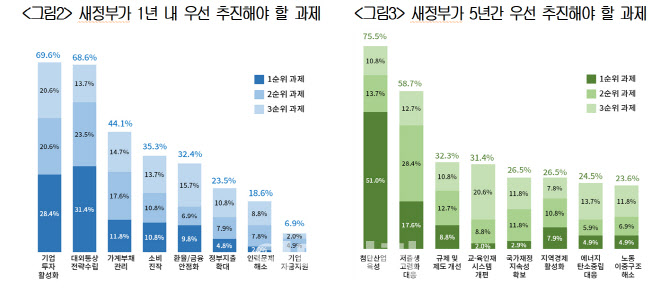 정부 출범 후 우리 경제의 성장동력을 되살리기 위해 1년 내 우선적으로 추진할 정책에 대해 ‘기업투자 활성화’(69.6%)와 ‘대외통상 전략 수립’(68.6%)을 꼽았다. 그외 △부동산 안정·가계부채 관리 △소비 진작 △환율·금융 안정화 등도 언급했다.