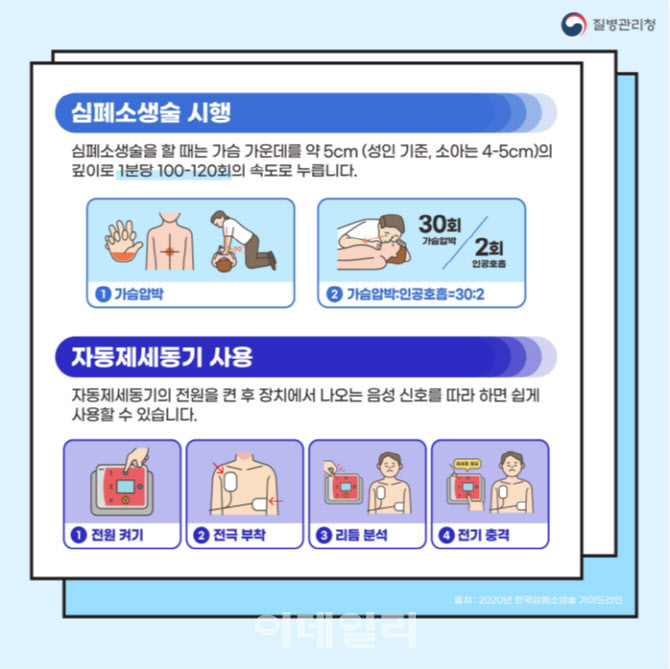 지영미 질병청장은 “급성심장정지 환자 생존율 및 뇌기능회복률이 상승 추이를 보이는 것은 일반인의 심폐소생술 시행과 연관된 고무적인 결과”라며, “심폐소생술은 환자의 생존과 회복에 결정적인 역할을 하며, 현장 목격자의 역할이 매우 중요하므로 일반인 심폐소생술이 더욱 확대될 수 있도록 교육자료 개발과 공모전 개최와 홍보 등 다양한 노력을 지속해 나가겠다”고 밝혔다.