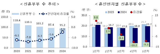 데이터처 관계자는 “혼인 5년 차 미만 신혼부부 수는 꾸준히 줄고 있지만, 1~2년 차는 혼인 건수가 늘며 감소 폭이 다소 완화됐다”며 “올해도 혼인 건수가 증가한 만큼 향후에는 4~5년 차 중심으로만 감소세가 나타날 가능성이 크다”고 설명했다.
