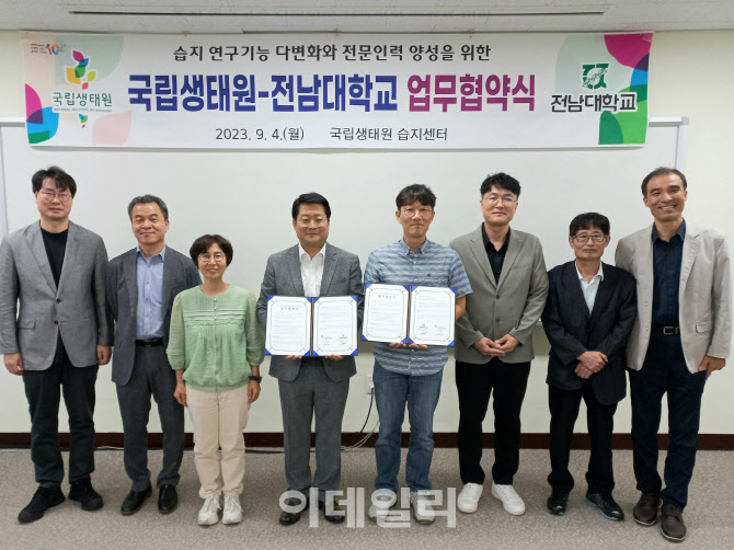 [이데일리 김태형 기자] 국립생태원 이중효(왼쪽 네번째부터) 습지센터장과 전남대학교 박춘구 생태바이옴 교육연구단장이 4일 업무협약을 진행하고 참석자들과 기념촬영을 하고 있다.