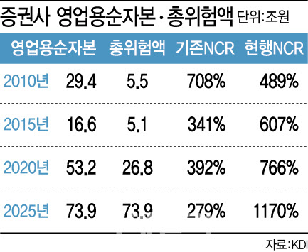 현행 산식에서는 자산이 커져도 분모가 늘지 않기 때문에 규모가 커질수록 지표가 개선되는 왜곡이 발생한다. 예컨대 영업용순자본 1조원·총위험액 5000억원인 회사와 영업용순자본 10조원·총위험액 5조원인 회사는 위험 구조가 같지만, 후자의 NCR은 전자의 10배 수준으로 뛴다. KDI는 “규모 확대만으로 건전성이 좋아진 것처럼 보이는 전형적 착시 효과”라고 설명했다.