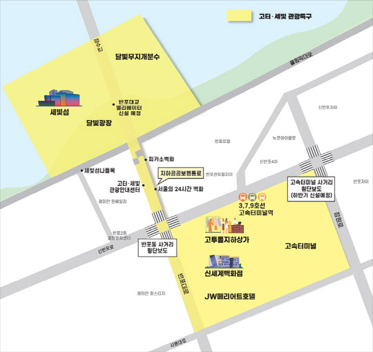 서초구는 관광객의 접근성을 높여 관광특구의 경제 활성화를 이끌겠다는 계획이다. 구는 올해 12월 지하보도로만 횡단할 수 있었던 고속버스터미널 사거리에 ‘□’자 횡단보도를 신설한다. 반포대교 남단에 엘리베이터 설치와 잠수교 전면 보행화가 이뤄지면 도심에서 한강까지 한번에 연결된다.
