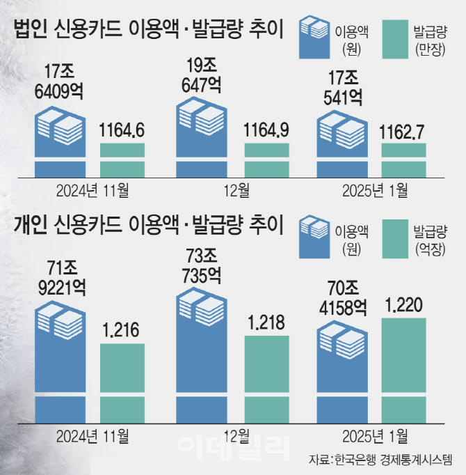 법인 신용카드 이용액도 줄고 있다. 지난 1월 총 이용금액은 17조 541억원으로 전월(19조 647억원)대비 10.5% 감소했다. 법인 신용카드 이용액은 지난 2022년 5월 19조 8544억원으로 고점을 기록한 뒤, 전고점을 넘지 못하고 있다.