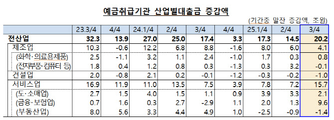 업권별로는 예금은행이 14조 3000억원 증가에서 20조 4000억원으로 증가세가 확대됐다. 비은행 예금취급기관은 2000억원 증가에서 3000억원 감소로 전환됐다.