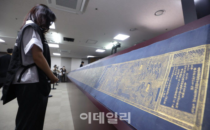 [이데일리 이영훈 기자] 8일 서울 종로구 국립고궁박물관에서 열린 '불교미술의 진수 고려 사경과 조선 불화의 귀환' 일본 환수 문화재 언론 공개 행사에서 관계자가 감지금니 대방광불화엄경 주본 권22 표지를 공개하고 있다.