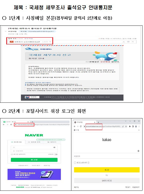 국세청은 “이메일을 통해 세무조사 출석요구 안내는 물론 연말정산과 관련하여 일체의 자료요구 등을 하지 않는다”며 “포털사이트 로그인 화면 연결을 통해 계정 정보를 요구하는 메일을 받은 경우에는 해당 메일을 즉시 삭제해 달라”고 당부했다.