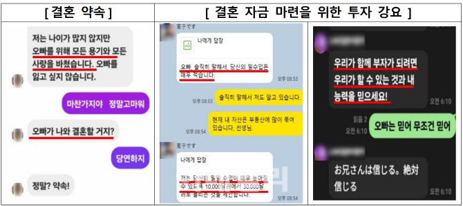 실제 사례도 발생했다. 지난 4월 50대 A씨는 데이팅 앱에서 일본인 여성 B씨의 접근을 받았다. 46일간 매일 대화를 나누며 연인 관계로 발전한 A씨는 결혼까지 약속했지만, B씨는 결혼 자금을 마련해야 한다며 가상자산 투자를 권유했다. 투자 경험이 없던 A씨는 처음엔 20만원만 투자했으나, 수익이 발생하고 일부 출금까지 되자 신뢰가 깊어졌다. 결국 A씨는 총 1억520만원을 투자했으나, ‘하루 5% 세금’이라는 명목으로 추가 입금을 요구받았다. 자금이 바닥나자 B씨는 이별을 통보하며 잠적했다.