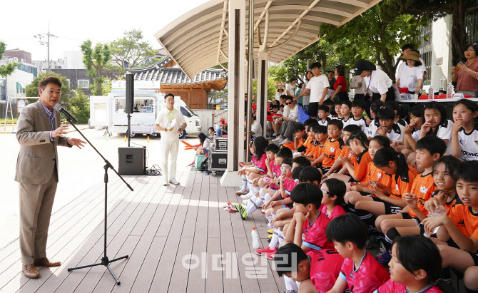 [이데일리 김태형 기자] 정문헌 종로구청장이 18일 재동초등학교에서 열린 '종로 작은학교 축구축제'에서 인사말을 하고 있다.