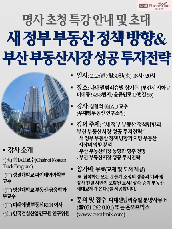 강연에서는 이 같은 시장 흐름에 대한 해석과 함께 부산지역 실수요자를 위한 맞춤형 내 집 마련 전략, 장기적인 시장 전망 등이 소개될 예정이다.