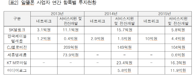 미래부가 제출한 주요 알뜰폰 사업자의 연간 항목별 투자 현황을 보면 보다 명확해 진다. 대기업 자회사로 알뜰폰 사업을 하는 사업자 정도만 적자를 감수하고 투자를 하였다. 이는 다른 소형 알뜰폰 사업자는 시설에 대한 투자 여력이 거의 없음을 보여준다.