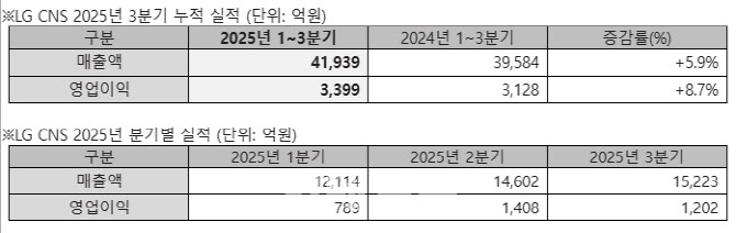LG CNS의 주요 성장 엔진인 AI와 클라우드 분야의 3분기 누적 매출은 전년동기 대비 14.7% 성장한 2조 4692억원을 기록했다. AI 분야에서 LG CNS는 금융 및 공공 AX 사업을 확대하며 시장 내 입지를 넓혀가고 있다. 특히 금융 영역의 AI·데이터 플랫폼 사업 및 외교부, 경기도교육청, 경찰청, 기상청, 인천국제공항공사, 한국해양진흥공사 등 주요 공공 분야 AX 사업을 잇따라 수주하며 안정적인 매출 성장을 이어가고 있다. LG CNS는 국가대표 소버린 AI 모델 ‘엑사원(EXAONE)’, LG CNS와 코히어가 공동 개발한 초대형·경량형 LLM 등 다양한 AI 모델을 기반으로 고객 맞춤형 서비스를 제공하고 있다.