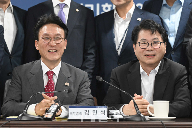 [포토]기념촬영하는 김민석 국무총리-이한주 국정기획위원회 위원장