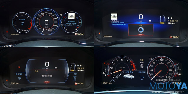 계기판은 한글화가 충실히 이루어져 있다. 내비게이션 연동 기능을 지원하지 않는다는 점은 아쉽게 느껴지지만 전반적으로 만족스런 구성을 취하고 있다. 계기는 밸런스, 단순, 고급, 성능의 네 개의 테마를 제공한다. 화려하게 디자인된 각각의 테마는 다양한 정보를 운전자에게 제공한다. 또한 헤드업 디스플레이까지 적용되어 있다.
