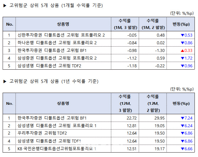 15일 금융정보업체 에프앤가이드에 따르면 지난 3월 한 달간 퇴직연금 디폴트옵션 데이터를 분석한 결과, 고위험군 상위 5개 상품 모두 마이너스 수익률을 기록한 것으로 집계됐다.