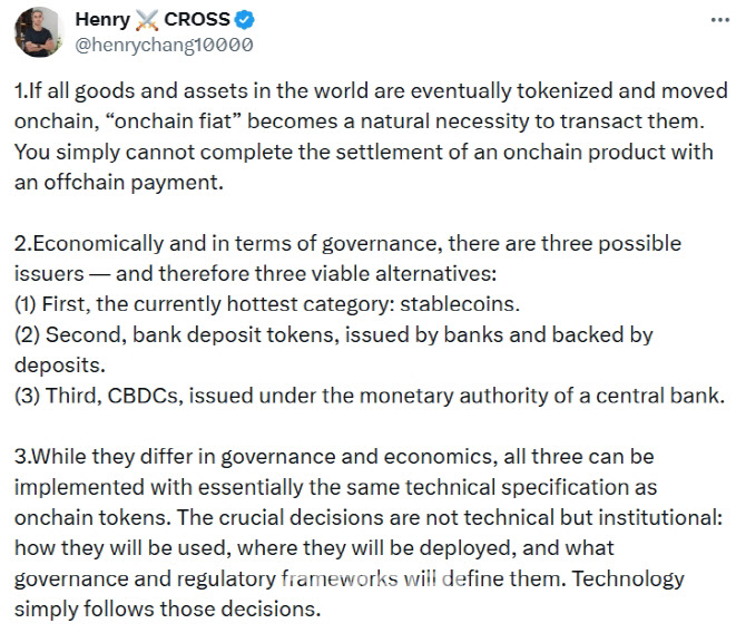 결과적으로 CBDC는 중앙은행, 예금토큰은 은행, 스테이블코인은 민간이 담당해야 한다는 견해를 밝혔다. 이는 발행 주체 간 역할을 분리해 경쟁·협력을 유도해야 한다는 취지다.