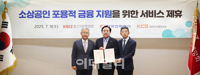 중소기업중앙회는 9일 서울 영등포구 중소기업중앙회에서 한국전력(015760), 코리아크레딧뷰로(KCB)와 함께 금융 취약계층 소상공인을 위한 대안신용평가 모형을 개발하고 ‘소상공인 포용적 금융지원을 위한 서비스 제휴’ 협약식을 개최했다.