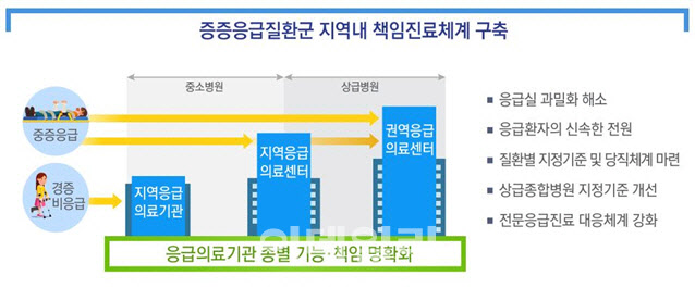 아울러 중증응급환자가 역량 있는 의료기관에서 집중 진료를 받을 수 있도록 종별 응급의료기관의 진료책임과 역할이 분명하게 규정하기로 했다. 권역·지역응급의료센터는 중증응급질환을 다루고, 지역응급의료기관은 경증·비응급환자 중심의 진료를 하면서 중증응급환자에 필요한 초기 처치 후 신속한 이송을 제공해야 한다는 점을 법적으로 명시한다.