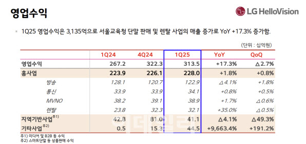 사업 부문별 매출은 방송 1229억원, 통신 341억원, 알뜰폰(MVNO) 389억원, 미디어와 B2B 등 지역기반사업 411억원, 렌탈 321억원, 기타사업(교육용 단말 등) 445억원을 기록했다.
