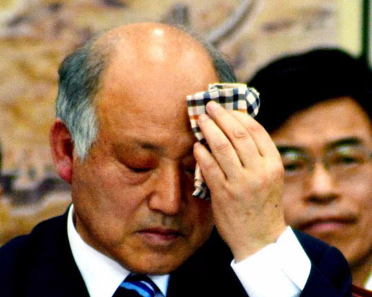 | | 지난 2014년 서울 여의도 국회 교육위원회 회의실에서 열린 교육부장관 후보자 인사청문회에서 김명수 당시 교육부 장관 후보자가 의원질문에 땀을 닦고 있다. (사진=뉴시스) |