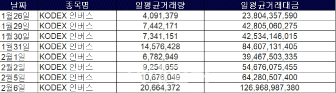 코스피 하락에 베팅하는 코덱스 인버스 ETF의 거래량은 지난달 26일 409만1379주에서 장중 2600선을 터치했던 29일에는 744만2171주까지 늘어났고, 다시 2500대로 지수가 하락한 31일에는 1457만6428주로 급증했다. 코스피가 고점을 찍고 하락할 것이라고 생각하는 투자자들이 그만큼 증가했다는 것으로 해석이 가능하다. 이후 꾸준히 줄었던 인버스 거래량은 전날 급락 장세 속에서 다시 1067만6049주까지 급증했고, 이날은 2066만4372주로 하루만에 거래량이 두 배 가까이 늘어났다. 코스닥 하락에 베팅하는 코덱스 코스닥150선물인버스 ETF 역시 지난달 26일 1536만1882주였던 일 평균 거래량이 이날 5985만814주까지 훌쩍 뛰었다. 자산운용사 한 관계자는 “인버스는 단기 투자 성격이 강하다”며 “지난달 말 증시가 급등하면서 고점이라고 생각한 투자자들이 단기 투자에 나서고 있는 것으로 보인다”고 설명했다.