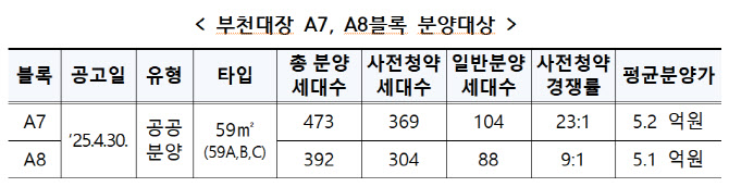 부천대장 A7, A8 블록은 2021년 12월 사전청약 당시 각 23 대 1(A7블록), 9대 비(A8)의 높은 경쟁률을 보였던 곳이다. 지난 달 30일부터 입주자 모집공고가 시작됐다.