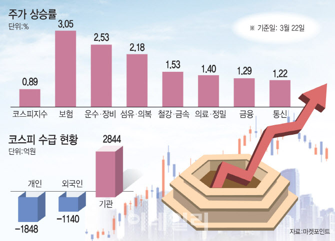 수급별로는 코스피 시장에서 개인과 외국인이 각각 1848억원, 1140억원 어치 차익실현에 나선 가운데 기관이 홀로 2844억원을 사들이며 지수를 끌어올렸다.