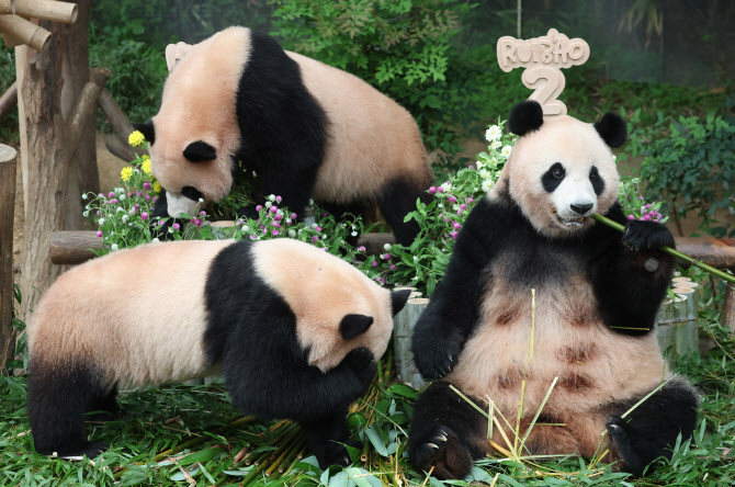 쌍둥이 아기판다 루이바오·후이바오가 두돌 생일을 맞은 7일 오전 경기 용인시 처인구 에버랜드 판다월드에서 엄마 아이바오와 루이바오·후이바오가 먹이를 먹고 있다.