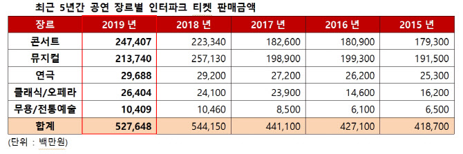 자료에 따르면 2019년 전체 공연 티켓 판매금액은 약 5276억원으로 2018년 5441억원보다 3% 정도 줄어들었다. 2017년부터 최근 3년간 연평균 성장률은 9.4%였다. 장르별로는 콘서트 2474억원, 뮤지컬 2137억원, 연극 296억원, 클래식·오페라 264억원, 무용·전통예술이 104억원이었다.
