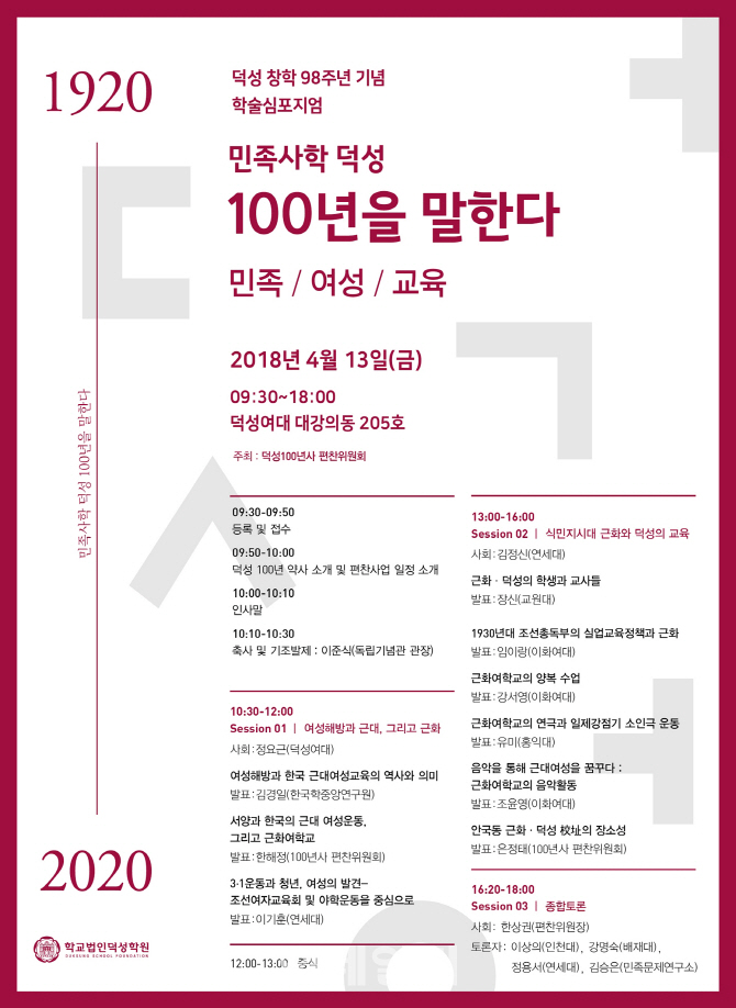 한상권 덕성100년사편찬위원장이 좌장을 맡아 종합토론을 진행한다. 토론자로는 이상의 인천대 초빙교수, 강명숙 배재대 교수, 정용서 연세대 연구원, 김승은 민족문제연구소 자료실장 등이 참여한다.