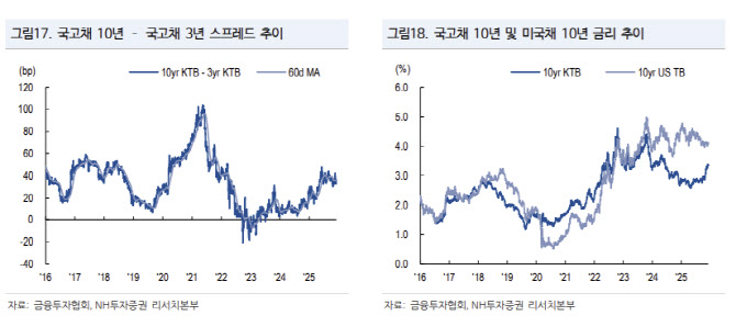 한은이 금리인하 휴지기에 진입한 만큼 국고채 만기가 짧은 단기 구간보단 장기 구간에 의해 커브가 결정될 것으로 분석했다. 그는 “장기 구간은 대외 금리 민감도가 높다”면서 “12월 하반월부터 고용지표 둔화 전망과 최근 3개월 연율화 물가가 안정되고 있는 만큼 미국 금리의 하방 압력이 강해질 것”이라고 짚었다.