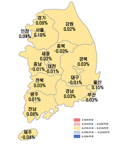 한편 전국 아파트 전세 가격은 0.09% 상승했다. 전주(0.08%) 대비 상승폭이 커졌다. 수도권은 0.11%에서 0.13% 올랐고 서울은 0.14%에서 0.15% 상승폭이 확대됐다. 서울은 서초구가 0.49%로 25개 자치구 중 상승폭이 가장 컸다. 지방은 0.05%로 전주와 같았다.