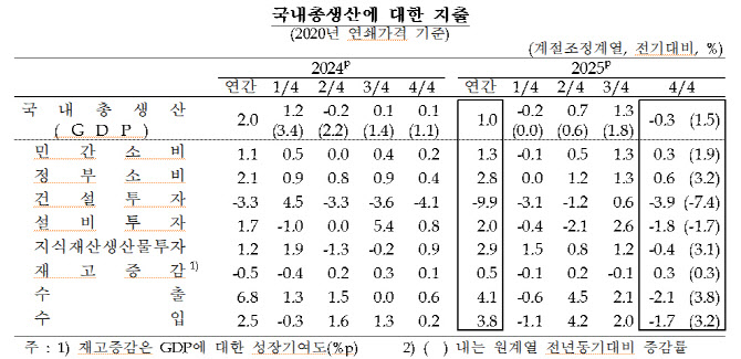 한국은행이 22일 발표한 ‘2025년 4분기 및 연간 실질 국내총생산(GDP)’에 따르면 지난해 실질 GDP는 4분기(10~12월) 전 분기 대비 0.3% 감소했다. 이에 따라 지난해 연간 성장률은 1.0%에 그쳤다.