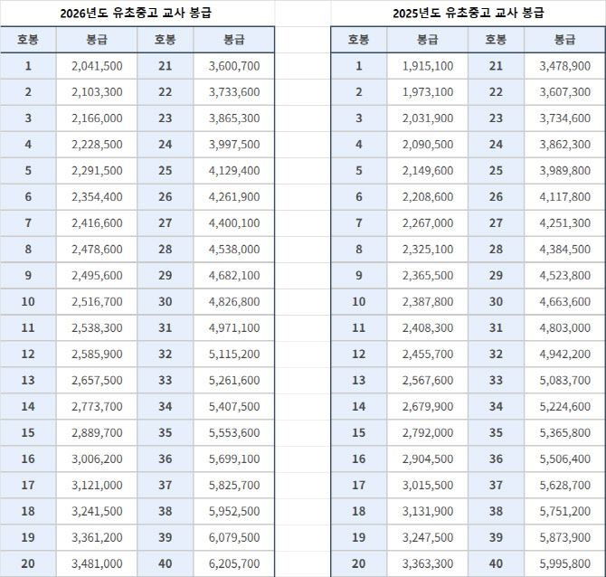 인사혁신처의 ‘2025·2026년 유·초·중·고 교원 봉급표’에 따르면 저연차로 분류되는 9호봉 기준 교사 봉급은 작년 월 236만5500원에서 올해 249만5600원으로 5.5%(13만100원) 인상된다. 8호봉은 같은 기간 232만5100원에서 247만8600원으로 6.6%(15만3500원) 오른다. 10호봉과 11호봉 인상률도 5.4%가 적용된다.