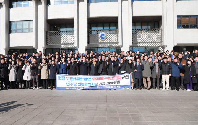 고남석 민주당 인천시당위원장과 국회의원, 지역위원장, 시·구의원 등 200여명은 이날 인천시청 앞에서 기자회견을 열고 “유정복 시장의 내란 옹호성 발언과 선거법 위반 기소는 시민 신뢰를 무너뜨린 중대한 사안”이라고 밝혔다.